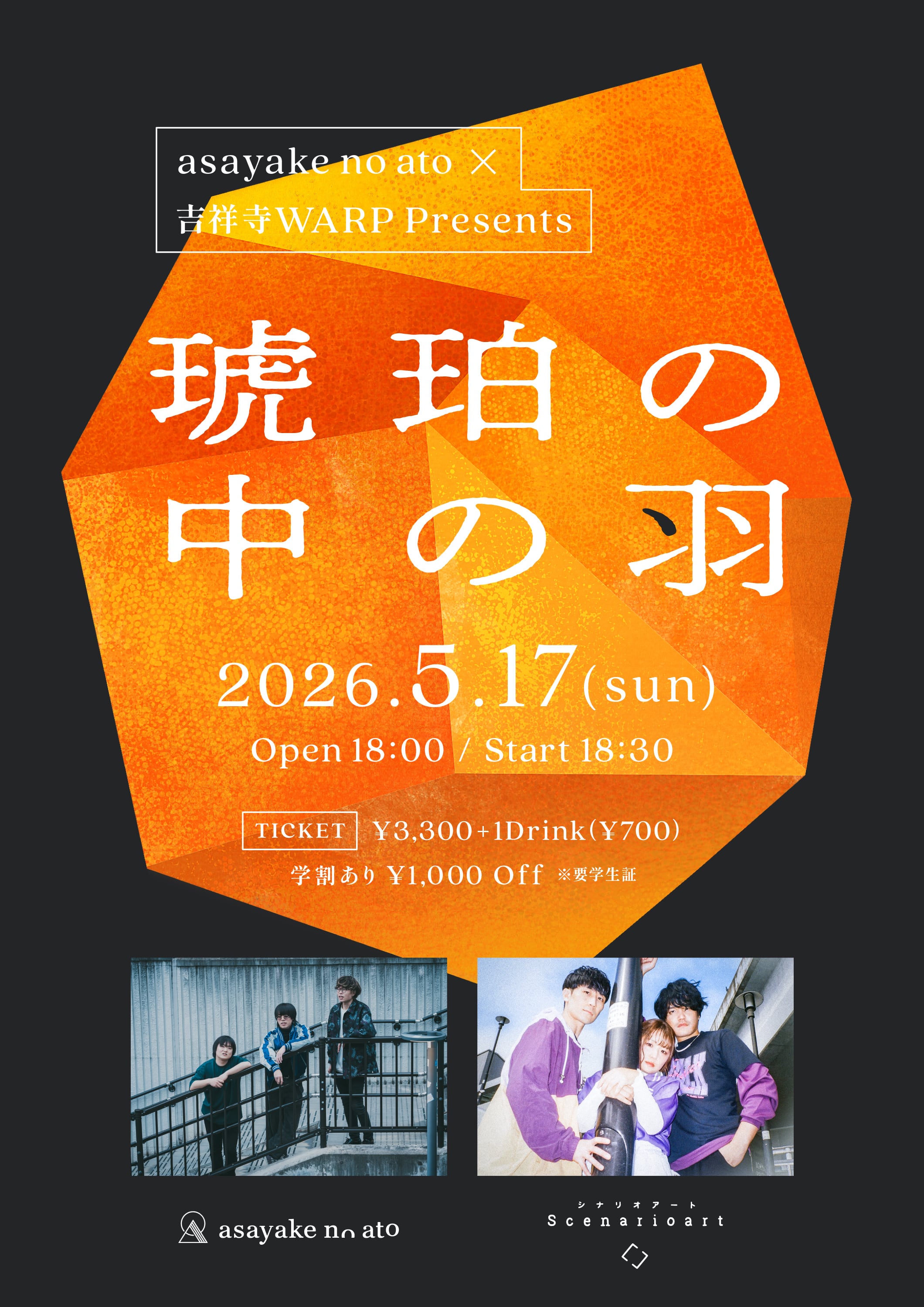 2026.05.17(日)@吉祥寺WARP asayake no ato × 吉祥寺WARP presents 「琥珀の中の羽」 出演:asayake no ato / シナリオアート OPEN 18:00 / START 18:30 TICKET ¥3,300 + 1Drink(¥700) 会場&通販で10枚限定の手売りチケットです。 最速で入場可能です。 フライヤーデザイン:Iwabuchi Mami